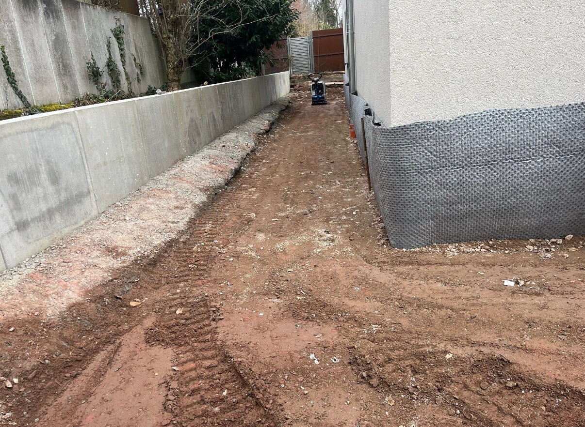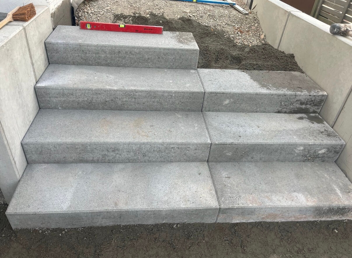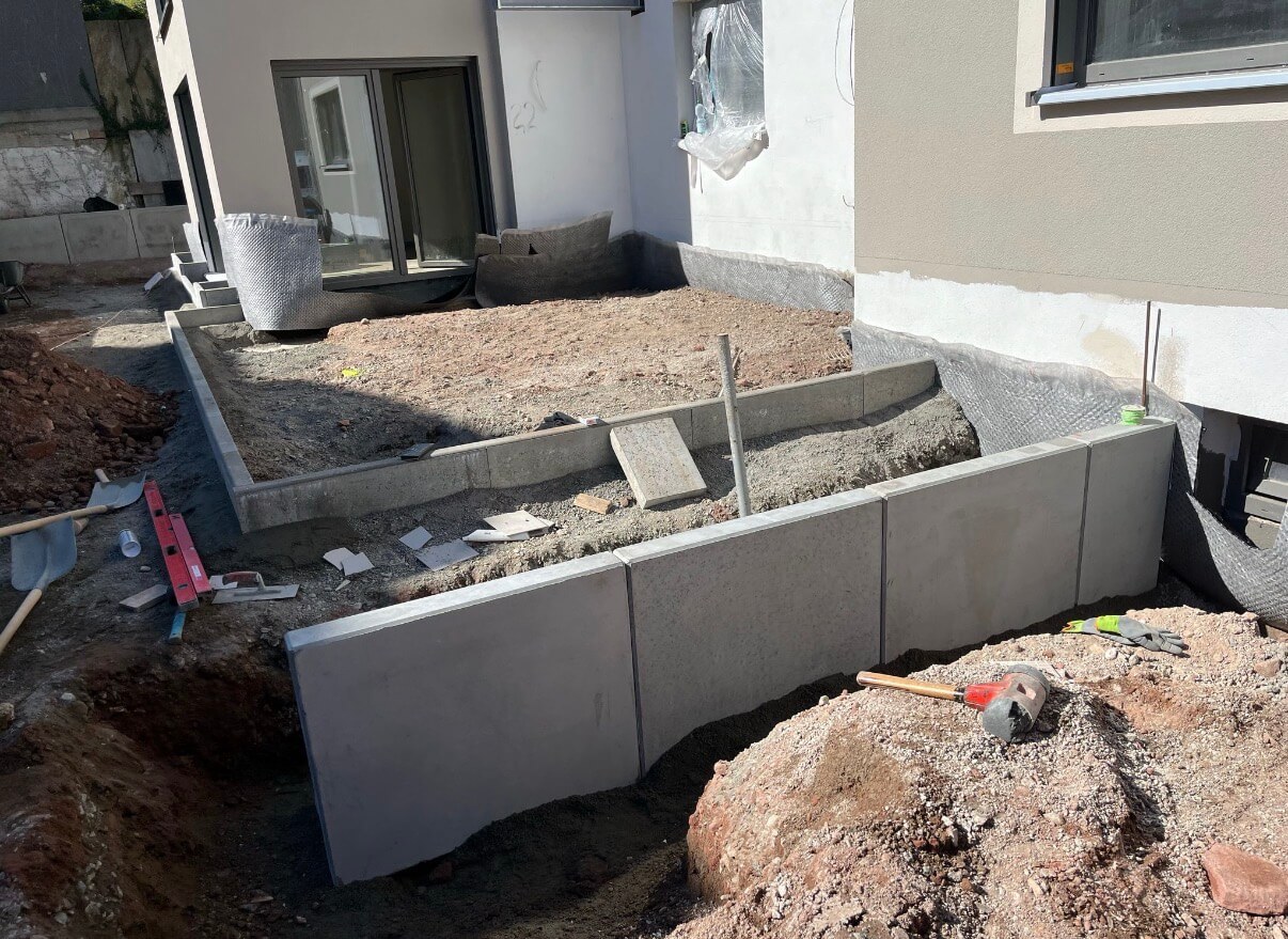 Stabilná a presne zrealizovaná oporná konštrukcia so schodiskom, pripravená na ďalšie exteriérové úpravy a dokončenie projektu.